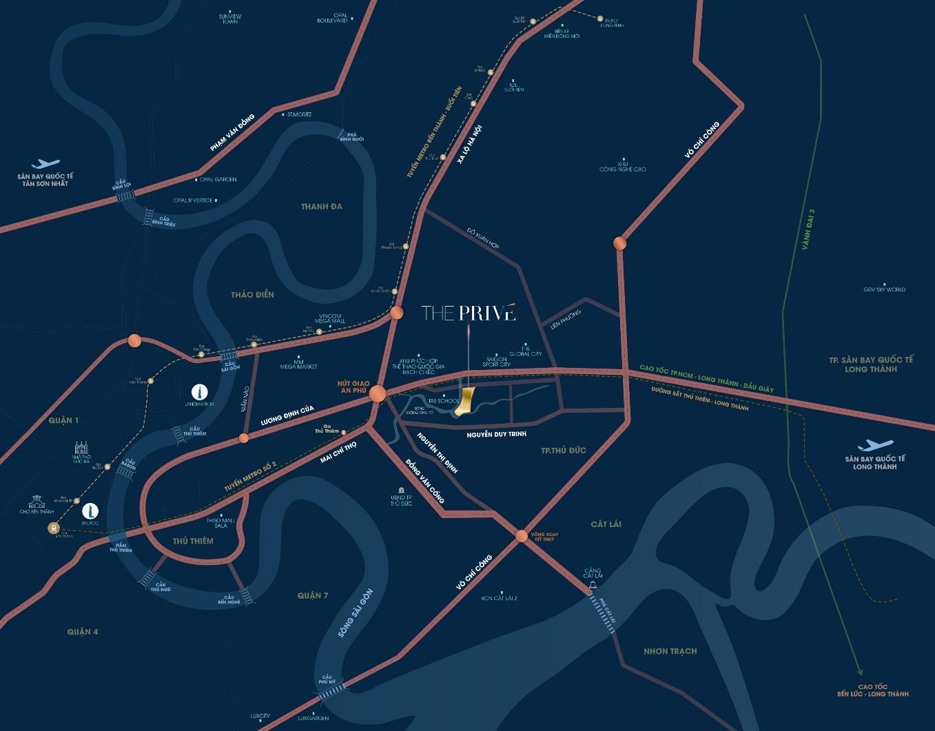 Vị trí dự án The Privé quận 2 kết nối nhanh đến nhiều tuyến đường lớn như: đường song hành cao tốc, nút giao An Phú, đường Mai Chí Thọ, đường Lương Định Của, đường Xa lộ Hà Nội, đường cao tốc TP.HCM – Long Thành – Dầu Giây, Hầm Thủ Thiểm, đường Đỗ Xuân Hợp, đường Vành Đai 2, tuyến Metro số 1 & số 2. Cư dân tại chung cư The Prive di chuyển nhanh chóng về các quận trung tâm.